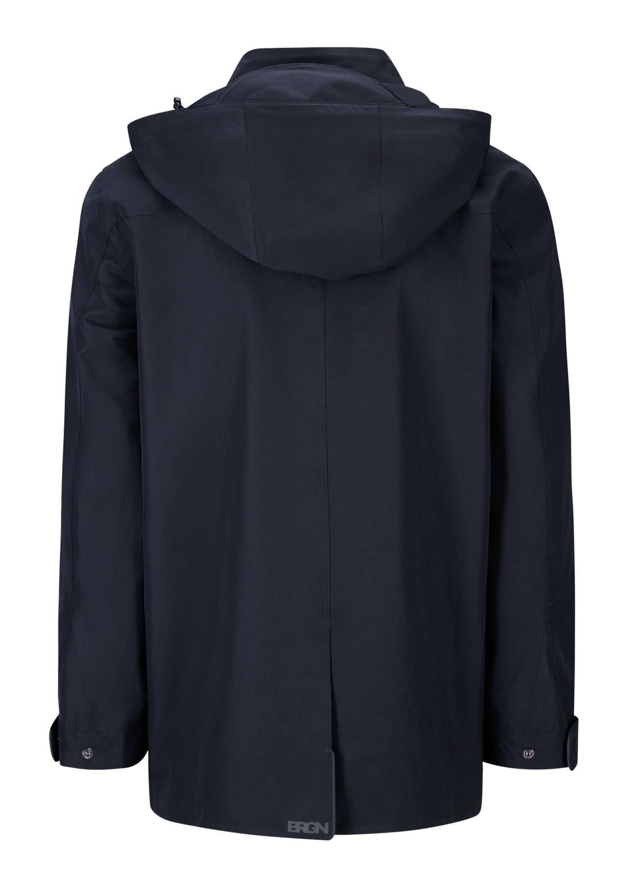 Måneskinn Jacket in Dark Navy has a clean design, relaxed fit, and comes with practical features like four large patch pockets with flaps and two hidden zip-side pockets underneath. It has an adjustable and detachable hood, while the center back split ensures ease of movement.